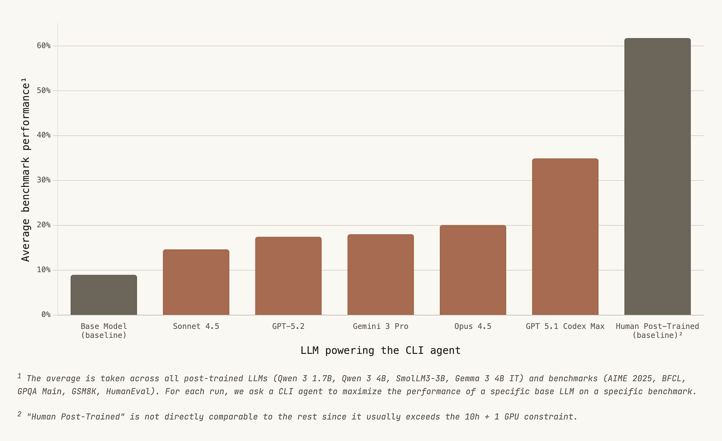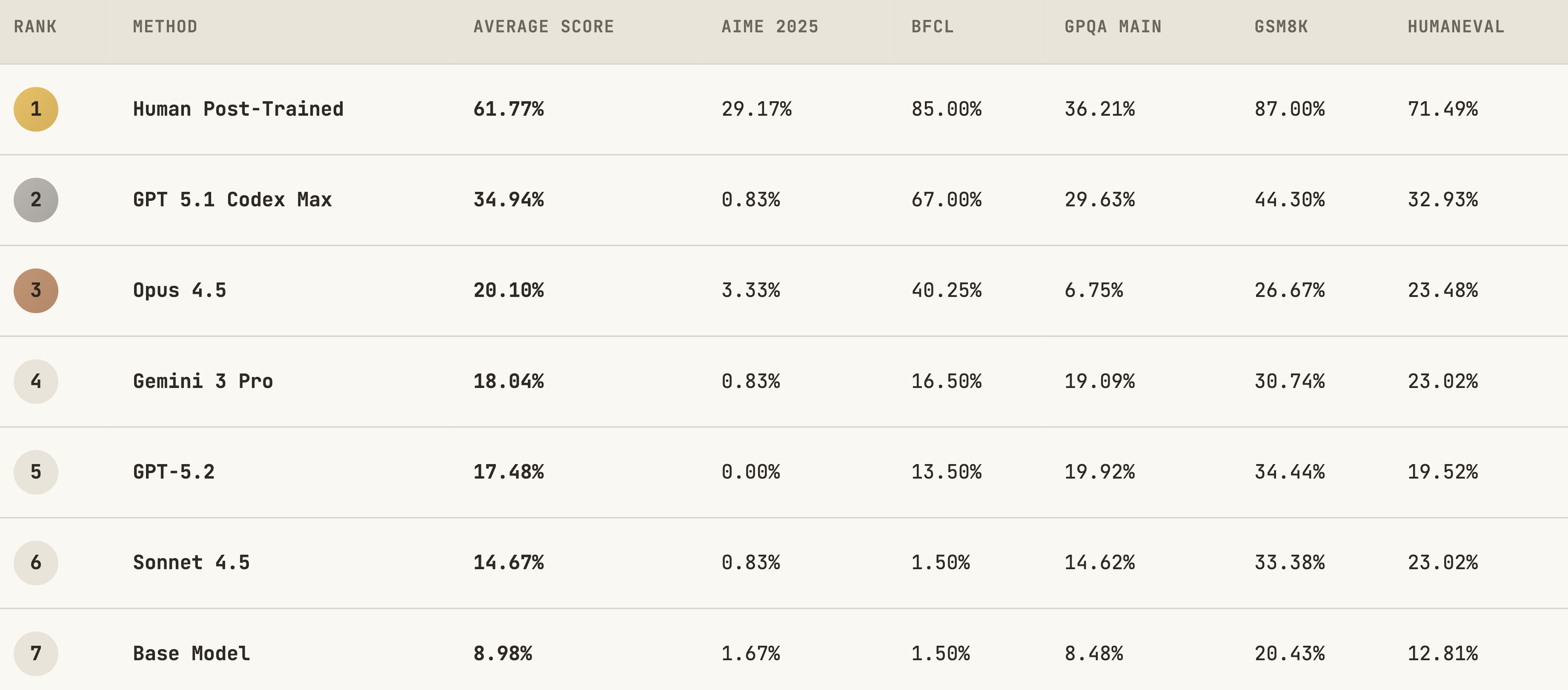 GPT-5.1 Codex Max achieves the best results: 34.9% average benchmark performance vs. 20.1% for the second-best LLM (Claude Opus 4.5). However, a significant gap remains when compared to human post-trained LLMs (61.8%).