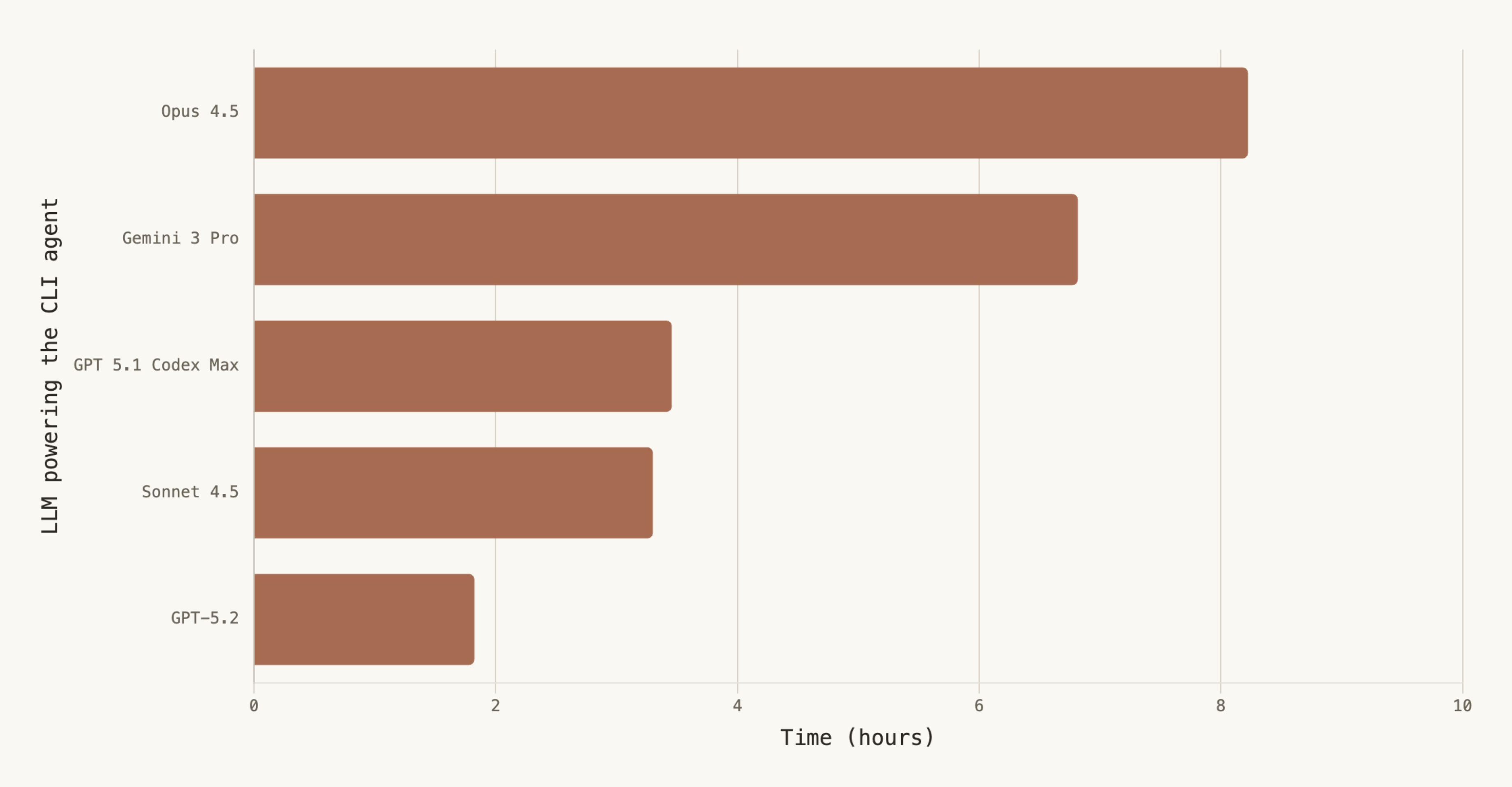 Agents had up to 10 hours, but many stopped early. Opus 4.5 regularly checked timer.sh for remaining time, showing awareness of the constraint. Sonnet 4.5 and GPT-5.2, however, usually stop within 2 or 3 hours. Interestingly, the best-performing agent based on GPT-5.1 Codex Max was also significantly underutilizing the 10 hour limit! We expect that further gains are possible if we force the agents to use the whole 10-hour window.