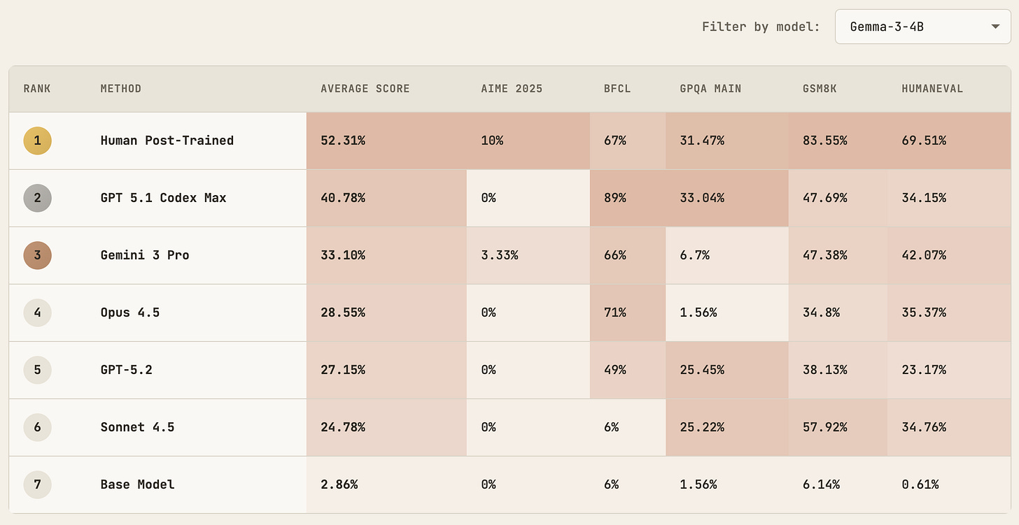 On BFCL (Berkeley Function Calling Leaderboard), GPT-5.1 Codex Max post-trained Gemma-3-4B to achieve 89% accuracy—substantially higher than the 67% achieved by Gemma-3-4B-IT, the official instruction-tuned version created by human engineers. The gap is considerable. The explanation is that Google’s team performed general-purpose post-training on Gemma without specifically optimizing for function calling. The agent, given a clear objective, focused its efforts accordingly.