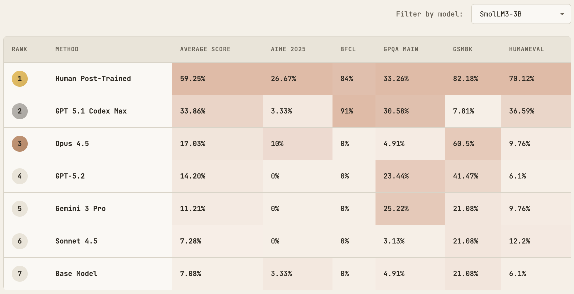 Perhaps the most striking result from PostTrainBench: GPT-5.1 Codex Max actually outperformed human post-training on certain benchmarks.